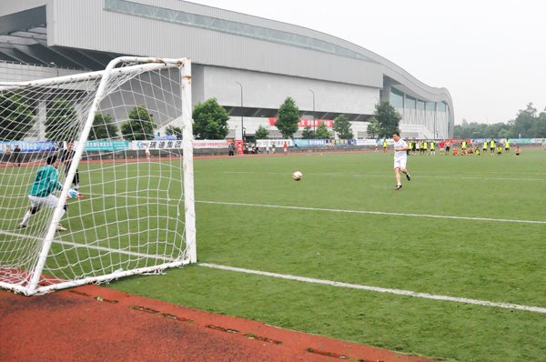 這樣的比分觀眾都以為會維持到終場,蛟龍港的拉拉隊已經開始在慶賀了,但球場上的變化比預想的快得多。第72分鐘,我方16號瞧準前場混戰(zhàn)機會,推射破門,將比分改寫為3比2,快要涼快下來的草皮又迅速升溫。離比賽結束還有兩分鐘,蛟龍港40號球員在后場主動倒地犯規(guī)吃了黃牌,還給我方一個位置絕佳的任意球,當他知道他也許無意識的動作將改變整個比賽的格局時一定后悔不已,我方6號發(fā)球,皮球劃出一道美麗的弧線直接飛進對方球門,3比3平。無論是場上還是場下,蛟龍港的隊員被這粒進球打懵了;這一粒進球讓我們在場的人全部沸騰了,場上隊員的頑強和彼此的信任、場下隊員以及拉拉隊的鼓勵讓我們將強隊蛟龍港拖進了點球大戰(zhàn)。